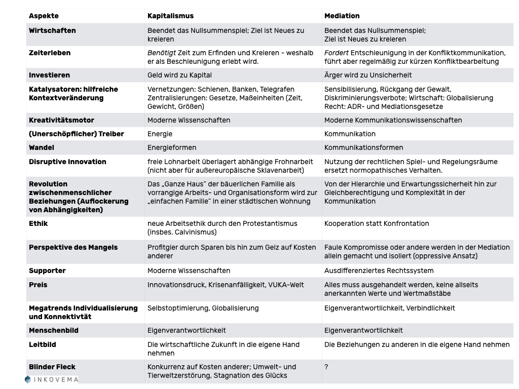 Während der befreiende Charakter positiv erlebt wird, wird dem unterwerfenden, weil machtanhäufenden Charakter der humanistischen Entwicklungsgeschichte weniger Beachtung geschenkt, geschweige denn in das Selbstverständnis der Mediation integriert, obschon das hilfreich wäre. In den Diskussionen[4]um den Einfluss von MediatorInnen zeigt sich diese Ungenauigkeit und Unsicherheit. Dieser zweite Teil des Beitrages[5]gibt der der Perspektive des wirtschaftsrevolutionären Kapitalismus Raum.