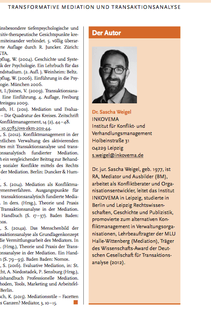 Prof. Dr. Sascha Weigel, Konfliktberater und Mediator; Rechtsanwalt lizenzierter Ausbilder für Mediation (BM) und lehrender Transaktionsanalytiker unter Supervision für den Bereich Organisation (PTSTA-O) sowie Senior Coach DBVC - berät, coacht, bloggt und podcastet hier zu Mediation und Konfliktmanagement in Zeiten der Digitalen Transformation. Begründer der Elemente der Mediation (www.elemente-der-mediation.de) sowie Inhaber von INKOVEMA. Zudem ist er im Beirat der Fachzteitschrift KonfliktDynamik. Begeisterter Fernwanderer und Fussballfan, der aktuell den Vaterfreuden den Vorrang einräumt - so gut er kann. Lebt in Leipzig und arbeitet bundesweit.