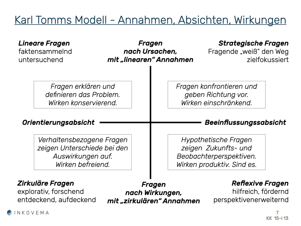 Aus diesem Grunde zum Schluss eine Landkarte der Frageformen von dem Systemtheoretiker Karl Tomm, die auch Auskunft darüber gibt, welche Absichten und mutmaßlichen Wirkungen hervorgerufen werden.
